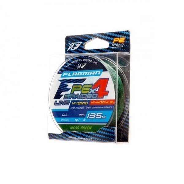 Flagman PE Hybrid F4 – гибридный шнур, изготовленный по технологии четырехжильного плетения: две жилы из высокомолекулярного полиэтилена, две – из полиэстера. Полиэстер придает шнуру более высокую абразивную устойчивость по сравнению со шнурами, произведенными только из полиэтилена. Flagman PE Hybrid имеет очень плотную структуру плетения. За счет этого абразивные частицы, взвешенные в воде, не попадают между волокон и не изнашивают кольца. Кроме того, плотно сплетенный шнур меньше пропитывается водой и меньше обмерзает в холодное время года. Также PE Hybrid F4 отличается повышенной устойчивостью к истиранию, может использоваться как в пресной, так и в соленой воде. Он обладает минимальной памятью и практически нулевой растяжимостью, что обеспечивает максимальную чувствительность снасти. Широкая линейка диаметров (от 0,06 мм до 0,5 мм) позволяет подобрать шнур как для ультралайтовой, так и для фидерной, морской или сомовьей снасти. Выпускается в размотках 100, 135, 150, 300, 600 метров. Яркие и флюоресцентные